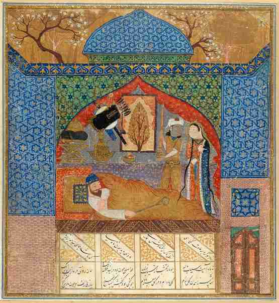 By the time Rostam retired to his room, he was very drunk. A little while later, he awoke from his drunken stupor to see a lovely princess standing in his room. She said she was Tahmineh and had been longing for him for a long time. Now that he was here, in a place he would never venture before, she would take her chances. Tahmineh boldly said that she wished to bear his son, his heir. In return, she would also help him find his horse. It was a no-brainer for Rostam, who happily agreed.