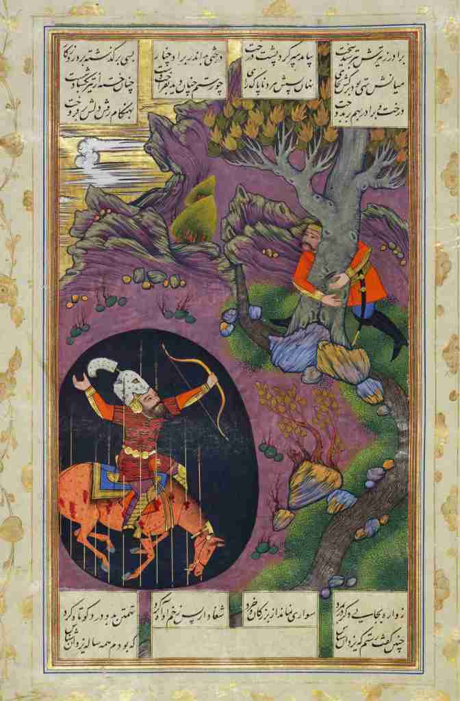 His brother had a moment of stupidity and approached Rostam to string his bow for him. As soon as he saw the bow in Rostam’s hands, he grew fearful and ran to hide behind a tree, but Rostam used the last of his strength to let an arrow fly, splintering the tree and killing Shaghad immediately.