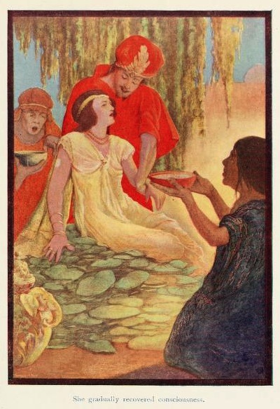 One day when the king was playing with Crescent’s hair, a lotus petal fell into her lap. She was so delicate that the petal wounded her and she fainted. Startled, the king sent for a servant and physician to attend to her.