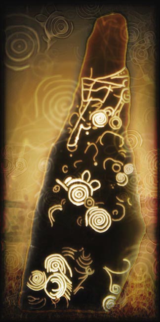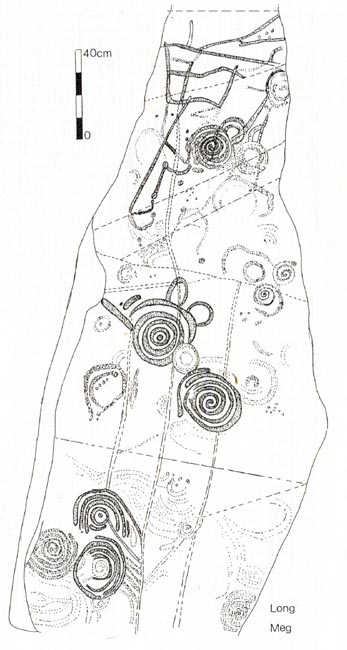 Images show some of the patterns on Long Meg from the Modern Antiquarian